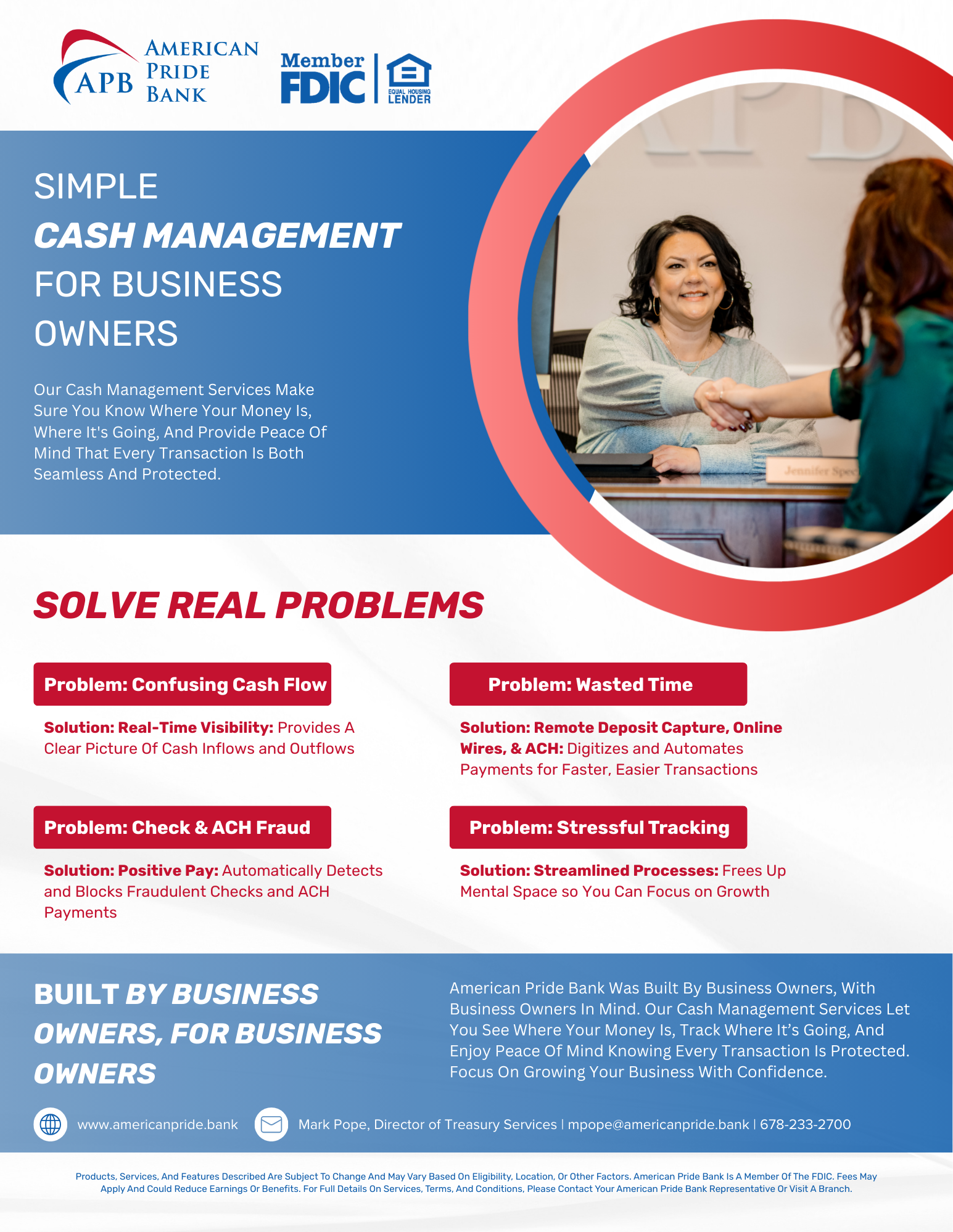 American Pride Bank was built by small business owners, for small business owners. We understand what it feels like to keep one eye on your business and one eye on your bank account. That’s why we make Cash Management simple, clear, and easy to use.