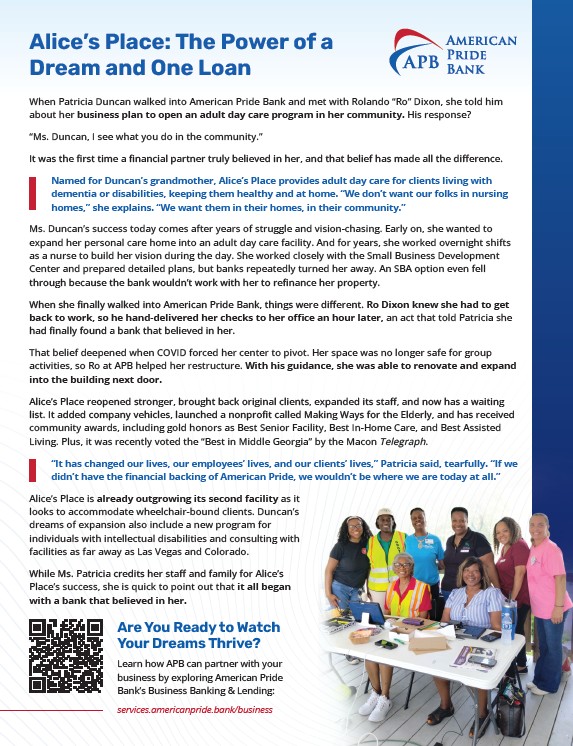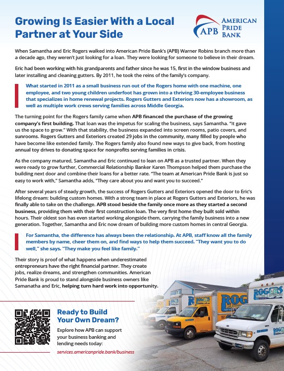 At American Pride Bank, relationships come first. We’re proud to serve families, entrepreneurs, homebuyers, and business owners with responsive service, local decision-making, and banking solutions designed to help them grow with confidence. From everyday banking to lending and long-term financial goals, we believe the best measure of our work is the success of the people we serve.